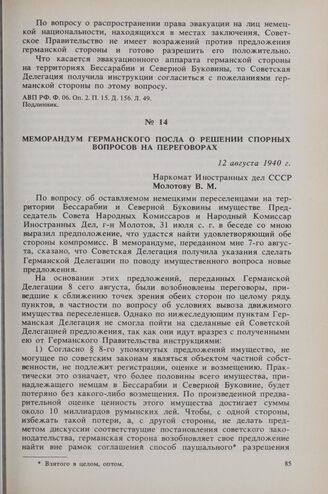 Меморандум германского посла о решении спорных вопросов на переговорах. 12 августа 1940 г. // АВП РФ. Ф. 06. Оп. 2. П. 15. Д. 156. Л. 63-65. Подлинник.