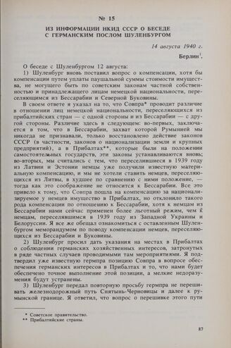 Из информации НКИД СССР о беседе с германским послом Шуленбургом. 14 августа 1940 г. // ГАРФ. Коллекция документов. Заверенная копия.