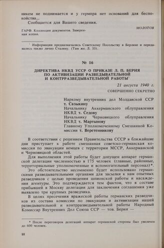 Директива НКВД УССР о приказе Л.П. Берия по активизации разведывательной и контрразведывательной работы. 21 августа 1940 г. // Архив Министерства Национальной Безопасности Республики Молдова. Материалы по эвакуации немцев с территории Бессарабии. Л. 1-4. Подлинник.