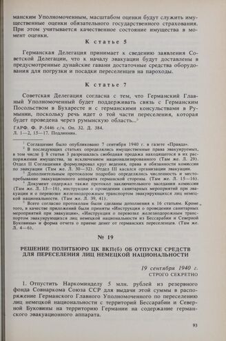 Решение Политбюро ЦК ВКП(б) об отпуске средств для переселения лиц немецкой национальности. 19 сентября 1940 г. // РЦХИДНИ. Ф. 17. Оп. 162. Д. 29. Л. 12. Выписка из протокола № 20 заседания Политбюро, пункт 228. Заверенная копия.