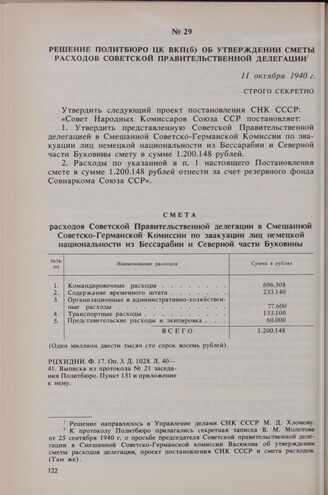 Решение Политбюро ЦК ВКП(б) об утверждении сметы расходов советской правительственной делегации. 11 октября 1940 г. // РЦХИДНИ. Ф. 17. Оп. 3. Д. 1028. Л. 40-41. Выписка из протокола № 21 заседания Политбюро. Пункт 151 и приложение к нему