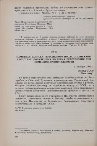 Памятная записка германского посла о денежных средствах, полученных во время переселения лиц немецкой национальности. 1 ноября 1940 г.
