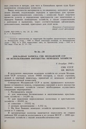Докладная записка СНК Молдавской ССР об использовании имущества немецких хозяйств. 4 декабря 1940 г. // ГАРФ. Ф. Р-5446с/ч. Оп. 32. Д. 7492. Л. 3-4, 12-14. Подлинник.