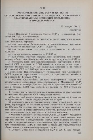 Постановление СНК СССР и ЦК ВКП(б) об использовании земель и имущества, оставляемых эвакуированным немецким населением в Молдавской ССР. 15 января 1941 г.