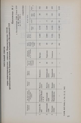 Приложение № 1 к постановлению СНК СССР и ЦК ВКП(б) от 5 января 1941 г. Титульный список зерно-животноводческих совхозов Наркомсовхозов СССР, организуемых на базе бывших немецких колоний в Молдавской ССР