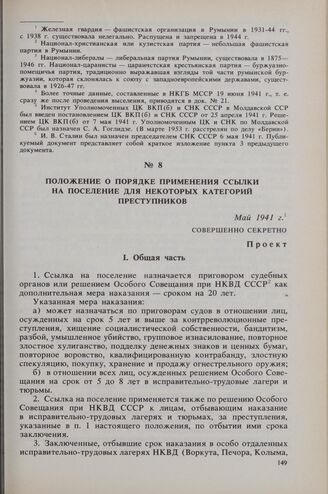 Положение о порядке применения ссылки на поселение для некоторых категорий преступников. Май 1941 г.