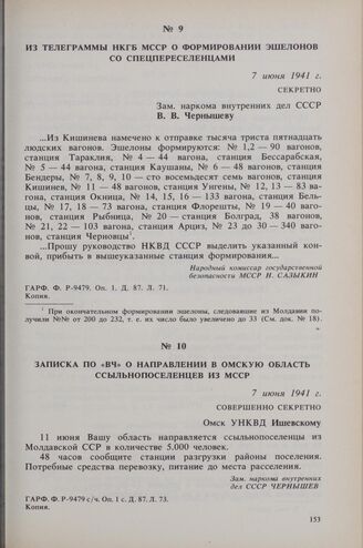 Записка по «ВЧ» о направлении в Омскую область ссыльнопоселенцев из МССР. 7 июня 1941 г. // ГАРФ. Ф. Р-9479 с/ч. Оп. 1с. Д. 87. Л. 73. Копия.