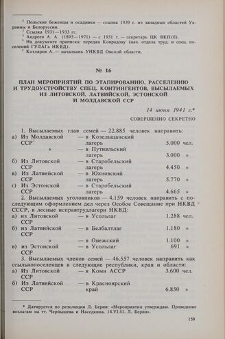 План мероприятий по этапированию, расселению и трудоустройству спец, контингентов, высылаемых из Литовской, Латвийской, Эстонской и Молдавской ССР. 14 июня 1941 г.