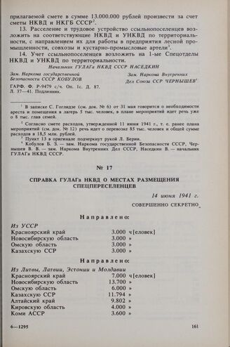 Справка ГУЛАГа о местах размещения спецпереселенцев. 14 июня 1941 г. // ГАРФ. Ф. Р-9479 с/ч. Оп. 1 с. Д. 87. Л. 44. Копия.