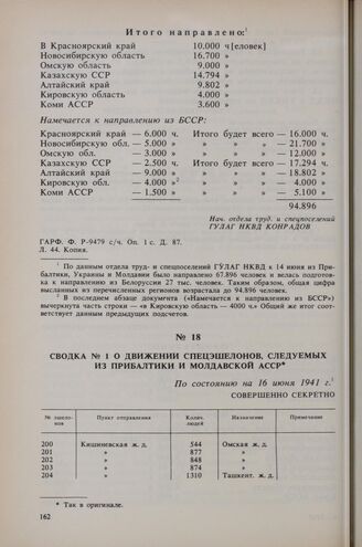 Сводка № 1 о движении спецэшелонов, следуемых из Прибалтики и Молдавской АССР. По состоянию на 16 июня 1941 г. // ГАРФ. Ф. Р-9479 с/ч. Оп. 1 с. Д. 87. Л. 106-107. Подлинник.