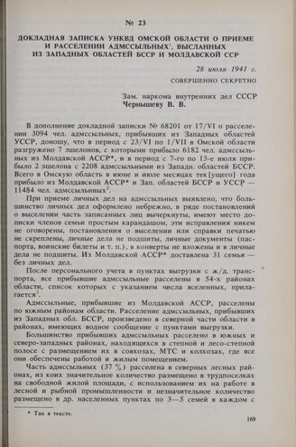 Докладная записка УНКВД Омской области о приеме и расселении адмссыльных, высланных из Западных областей БССР и Молдавской ССР. 28 июля 1941 г.