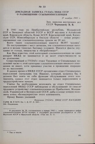 Докладная записка ГУЛАГа НКВД СССР о размещении ссыльнопоселенцев. 27 ноября 1941 г.