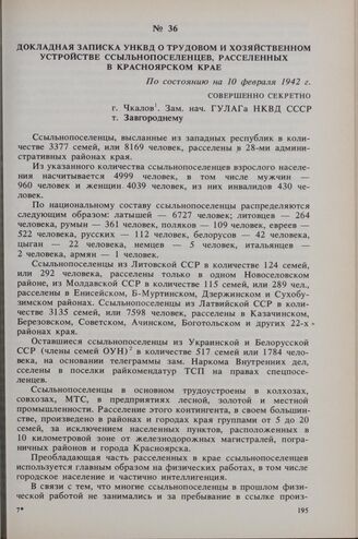 Докладная записка УНКВД о трудовом и хозяйственном устройстве ссыльнопоселенцев, расселенных в Красноярском крае. По состоянию на 10 февраля 1942 г.