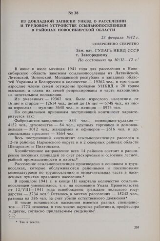 Из докладной записки УНКВД о расселении и трудовом устройстве ссыльнопоселенцев в районах Новосибирской области. 23 февраля 1942 г. // ГАРФ. Ф. Р-9479с/ч. Оп. 1с. Д. 81. л. 79-88. Подлинник.