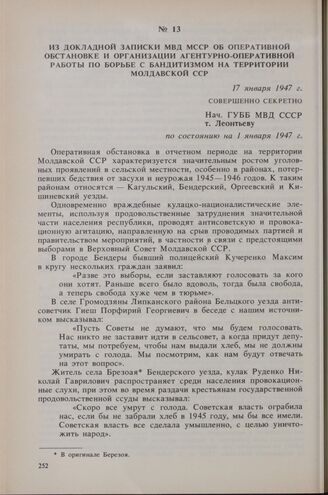 Из докладной записки МВД МССР об оперативной обстановке и организации агентурно-оперативной работы по борьбе с бандитизмом, на территории Молдавской ССР. 17 января 1947 г. // ГАРФ. Ф. Р-9478с/ч. Оп. 1с. Д. 973. Л. 2-14. Подлинник.