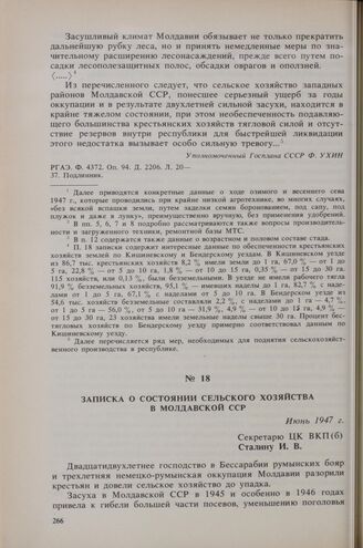 Записка о состоянии сельского хозяйства в Молдавской ССР. Июнь 1947 г. // РЦХИДНИ. Ф. 573. Оп. 1. Д. 20. Л. 41-43. Копия.
