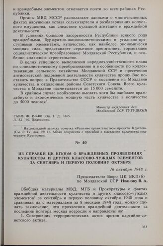Из справки ЦК КП(б)М о враждебных проявлениях кулачества и других классово-чуждых элементов за сентябрь и первую половину октября. 16 октября 1948 г. // РЦХИДНИ. Ф. 573. Оп. 1. Д. 28. Л. 114-116. Подписанная копия.