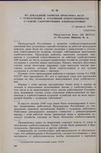 Из докладной записки прокурора МССР о привлечении к уголовной ответственности кулаков, саботирующих хлебозаготовки. 12 февраля 1949 г. // РЦХИДНИ. Ф. 573. Оп. 1. Д. 37. Л. 75-82. Подлинник.