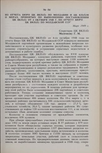 Из отчета Бюро ЦК ВКП(б) по Молдавии и ЦК КП(б)М о мерах, принятых по выполнению постановления ЦК ВКП(б) от 4 октября 1948 г. по отчету бюро ЦК ВКП(б) по Молдавской ССР. Март 1949 г. // РЦХИДНИ. Ф. 573. Оп. 1. Д. 34. Л. 1-17. Копия.