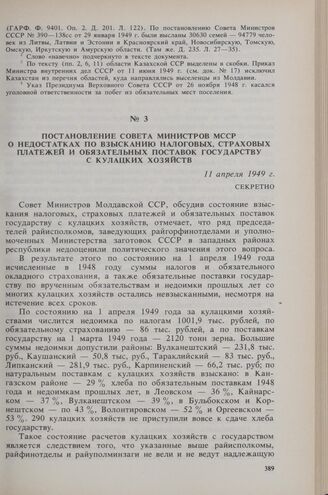 Постановление Совета Министров МССР о недостатках по взысканию налоговых, страховых платежей и обязательных поставок государству с кулацких хозяйств. 11 апреля 1949 г.