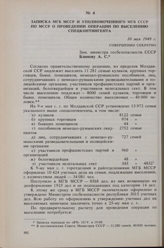 Записка МГБ МССР и уполномоченного МГБ СССР по МССР о проведении операции по выселению спецконтингента. 10 мая 1949 г.