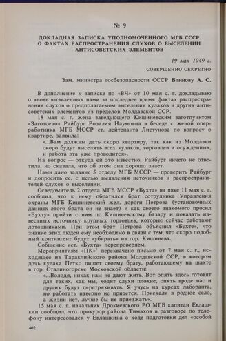 Докладная записка уполномоченного МГБ СССР о фактах распространения слухов о выселении антисоветских элементов. 19 мая 1949 г. // Архив Министерства Национальной Безопасности Республики Молдова. Дело по операции «Юг». Л. 46-48. Копия.