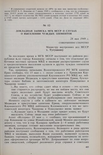 Докладная записка МГБ МССР о слухах о выселении чуждых элементов. 28 мая 1949 г. // Архив Министерства Национальной Безопасности Республики Молдова. Дело по операции «Юг». Л. 49-51. Копия.
