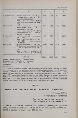Главная Пасат В.И. Трудные страницы истории Молдовы. 1940-1950-е гг. — М.: ... Записка по «ВЧ» о кулаках, состоящих в колхозах. 21 июня 1949 г.