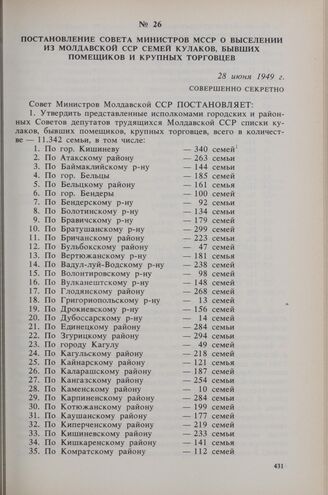 Постановление Совета Министров МССР о выселении из Молдавской ССР семей кулаков, бывших помещиков и крупных торговцев. 28 июня 1949 г.