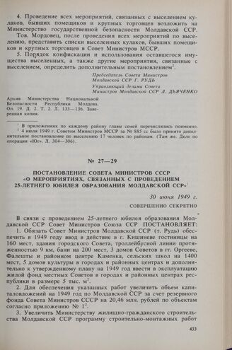 Постановление Совета Министров СССР «О мероприятиях, связанных с проведением 25-летнего юбилея образования Молдавской ССР». 30 июня 1949 г. // ГАРФ. Ф. Р-5446 с/ч. Оп. 53. Д. 7449. Л. 28-30. Заверенная копия.