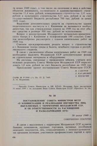 Постановление Совета Министров МССР «О конфискации и реализации имущества лиц, выселяемых с территории Молдавской ССР, и об ответственности за расхищение и разбазаривание его». 30 июня 1949 г.