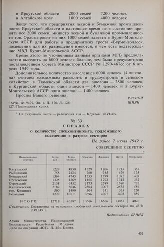 Справка о количестве спецконтингента, подлежащего выселению в разрезе секторов. Не ранее 2 июля 1949 г. // Архив Министерства Национальной Безопасности Республики Молдова. Дело по операции «ЮГ». Л. 254. Копия.