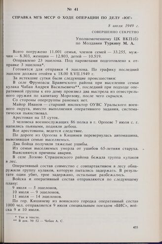 Справка МГБ МССР о ходе операции по делу «Юг». 8 июля 1949 г.