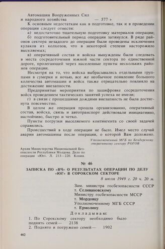 Записка по «ВЧ» о результатах операции по Делу «Юг» в Сорокском секторе. 8 июля 1949 г. 20 ч. 20 м. // Архив Министерства Национальной Безопасности Республики Молдова. Дело по операции «Юг». Л. 145-148. Копия.