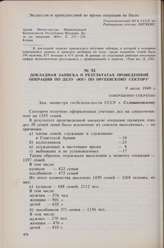 Докладная записка о результатах проведенной операции по делу «Юг» по Оргеевскому сектору. 9 июля 1949 г. // Архив Министерства Национальной Безопасности Республики Молдова. Дело по операции «Юг». Л. 209-212. Подлинник.