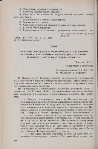 Из спецсообщения о реагировании населения в связи с выселением из Молдавии кулаков и прочего антисоветского элемента. 14 июля 1949 г.