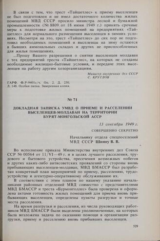 Докладная записка УМВД о приеме и расселении выселенцев — молдаван на территории Бурят-Монгольской АССР. 13 сентября 1949 г.