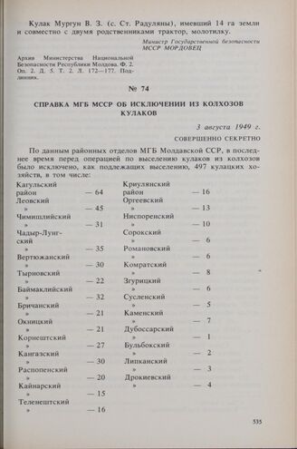 Справка МГБ МССР об исключении из колхозов кулаков. 3 августа 1949 г. // Архив Министерства Национальной Безопасности Республики Молдова. Дело по операции «ЮГ». Л. 178-182. Подлинник.