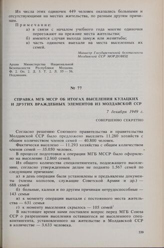 Справка МГБ МССР об итогах выселения кулацких и других враждебных элементов из Молдавской ССР. 7 декабря 1949 г. // Архив Министерства Национальной Безопасности Республики Молдова. Дело по операции «Юг». Л. 262-263. Копия.