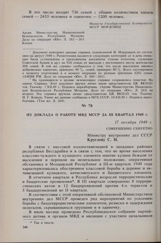 Из доклада о работе МВД МССР за III квартал 1949 г. 17 октября 1949 г. // ГАРФ. Ф. Р-9401. Оп. 1. Д. 3516. Л. 240-254. Подлинник.