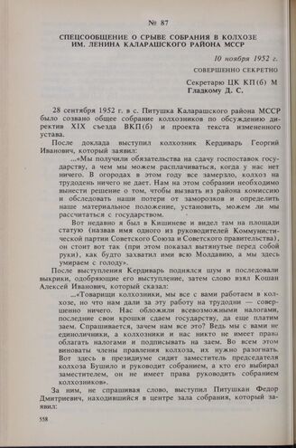 Спецсообщение о срыве собрания в колхозе им. Ленина Каларашского района МССР. 10 ноября 1952 г.