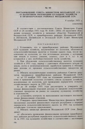 Постановление Совета Министров Молдавской ССР «О налоговом обложении кулацких хозяйств в Правобережных районах Молдавской ССР». 9 ноября 1951 г. // Архив Правительства Республики Молдова. Дело с постановлениями 1951 г. Л. 152-153. Подлинник.