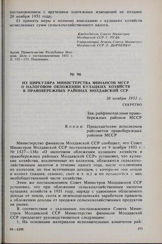 Из циркуляра Министерства финансов МССР о налоговом обложении кулацких хозяйств в Правобережных районах Молдавской ССР. 10 ноября 1951 г.
