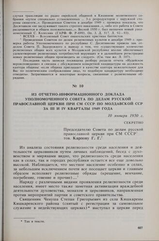 Из отчетно-информационного доклада уполномоченного Совета по делам русской православной церкви при СМ СССР по Молдавской ССР за III и IV кварталы 1949 года. 10 января 1950 г.