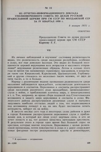 Из отчетно-информационного доклада уполномоченного Совета по делам русской православной церкви при СМ СССР по Молдавской ССР за IV квартал 1950 г. 8 января 1951 г. // ГАРФ. Ф. Р-6991. Оп. 1. Д. 714. Л. 61-62. Подлинник.