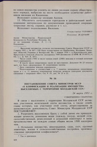 Постановление Совета Министров МССР «О конфискации и реализации имущества выселяемых с территории Молдавской ССР. 24 марта 1951 г.