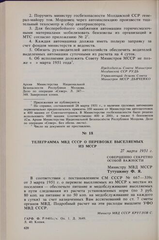 Телеграмма МВД СССР о перевозке выселяемых из МССР. 27 марта 1951 г.