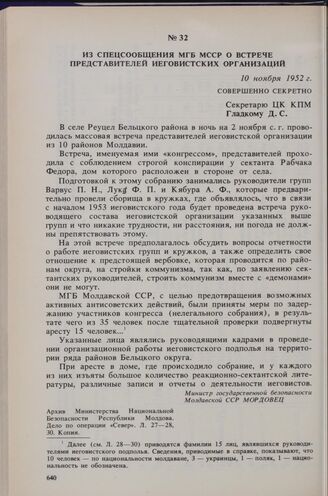 Из спецсообщения МГБ МССР о встрече представителей иеговистских организаций. 10 ноября 1952 г. // Архив Министерства Национальной Безопасности Республики Молдова. Дело по операции «Север». Л. 27-28, 30. Копия.