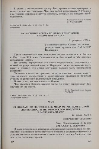 Разъяснение Совета по делам религиозных культов при СМ МССР. 8 февраля 1956 г. // ГАРФ. Ф. Р-6991. Оп. 3. Д. 520. Л. 27. Заверенная копия.