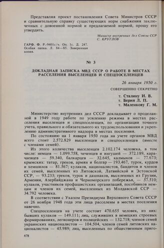Докладная записка МВД СССР о работе в местах расселения выселенцев и спецпоселенцев. 26 января 1950 г.